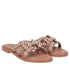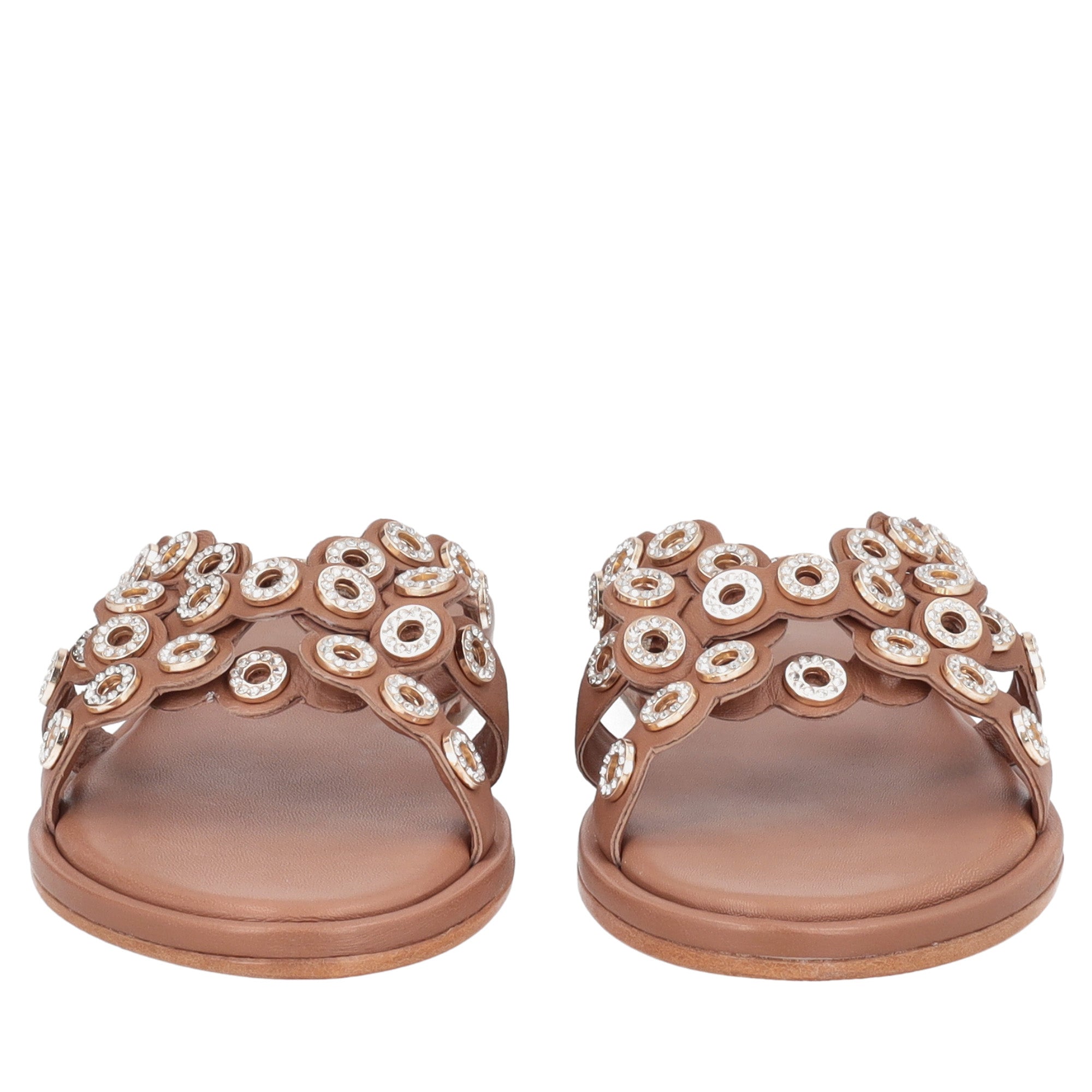 For your next summer outfits, focus on these flat sandals in biscuit-colored leather, with an elegant aesthetic and attention to detail. The sails embellished with micro metal applications give a sophisticated touch to the model, while the low heel ensures comfort during the day. Flat leather sandals are perfect with light dresses or cropped trousers for a neat and contemporary look.