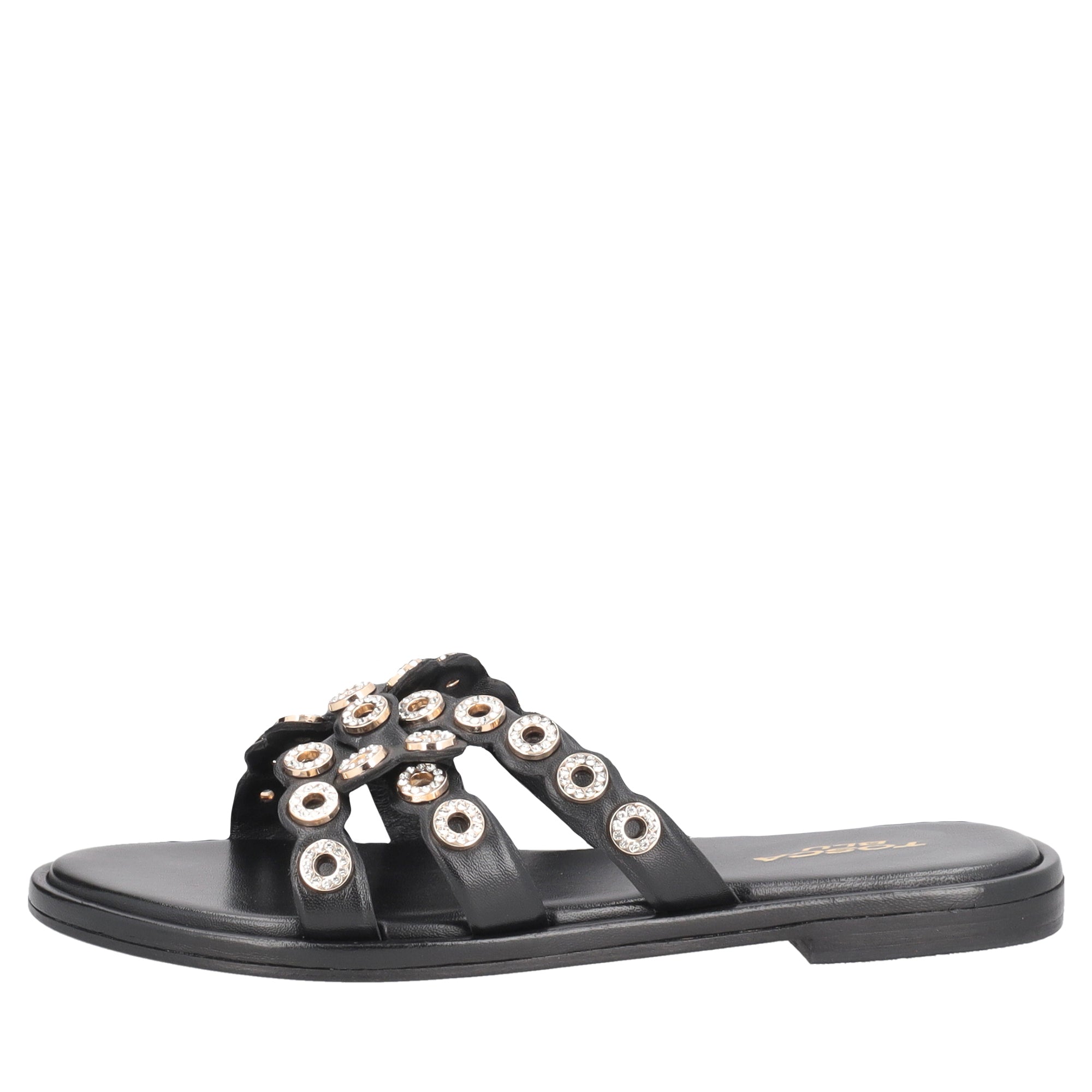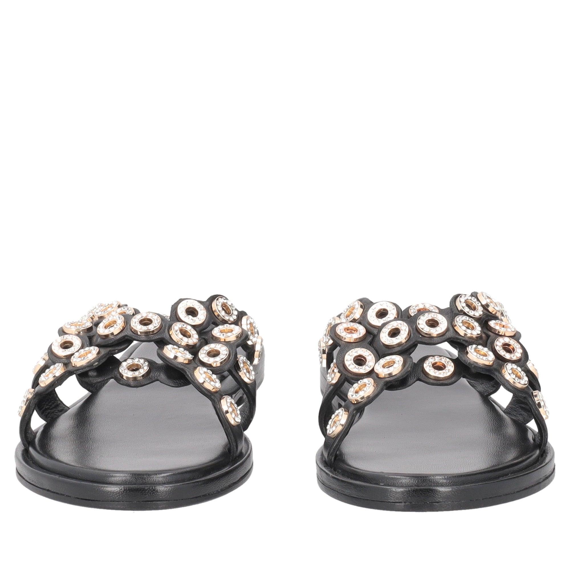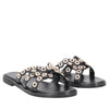 For your next summer outfits, focus on these flat sandals in black leather with an elegant aesthetic and attention to detail. The sails embellished with micro metal applications give a sophisticated touch to the model, while the low heel ensures comfort during the day. Flat leather sandals are perfect with light dresses or cropped trousers for a neat and contemporary look.