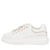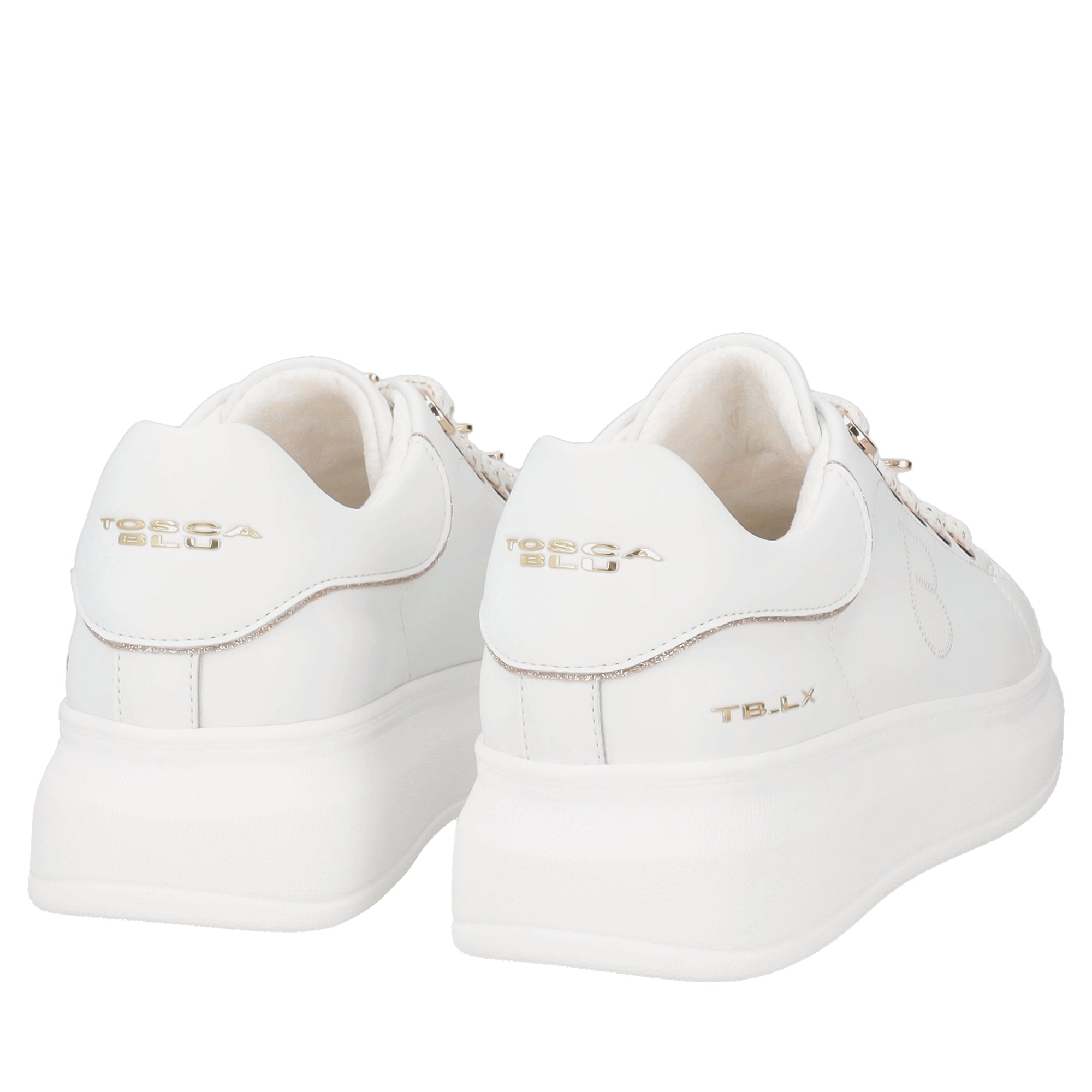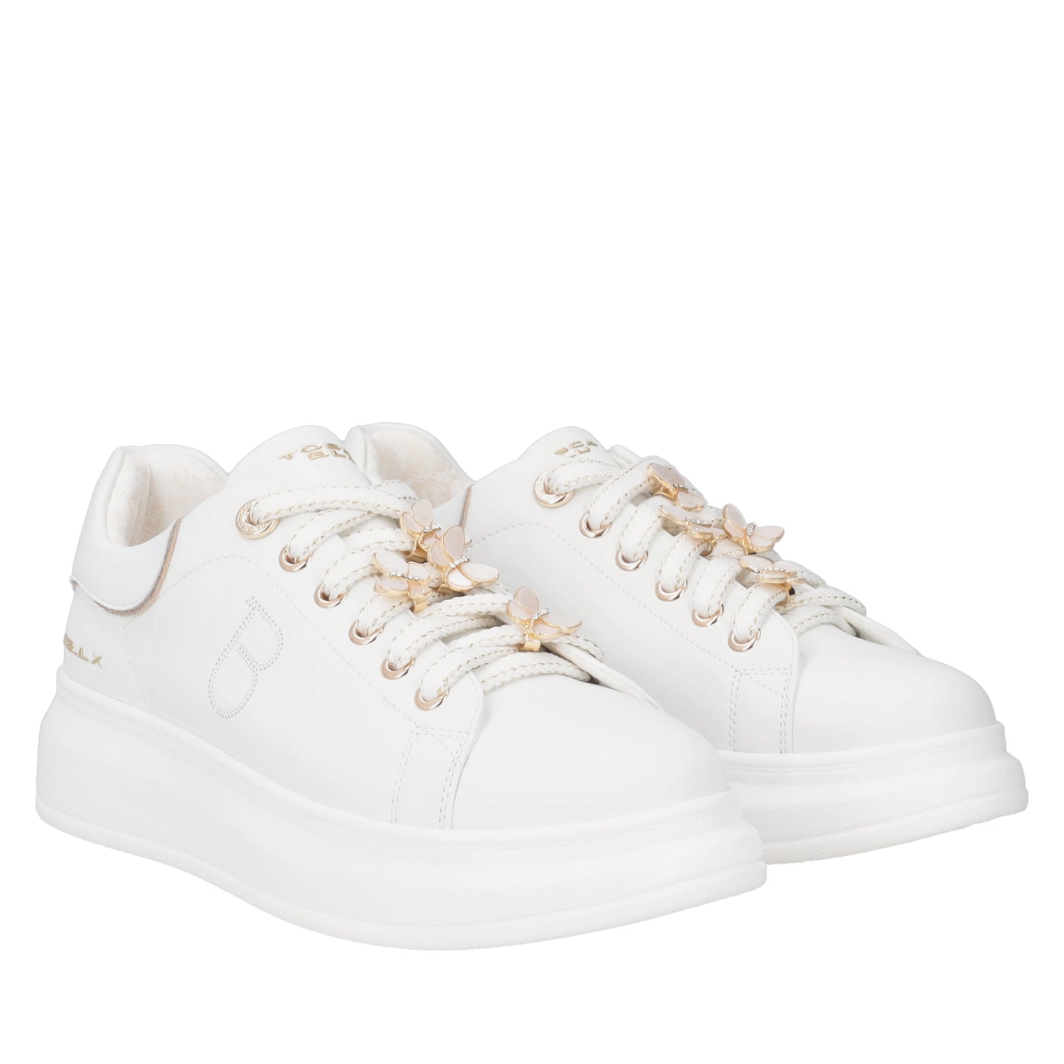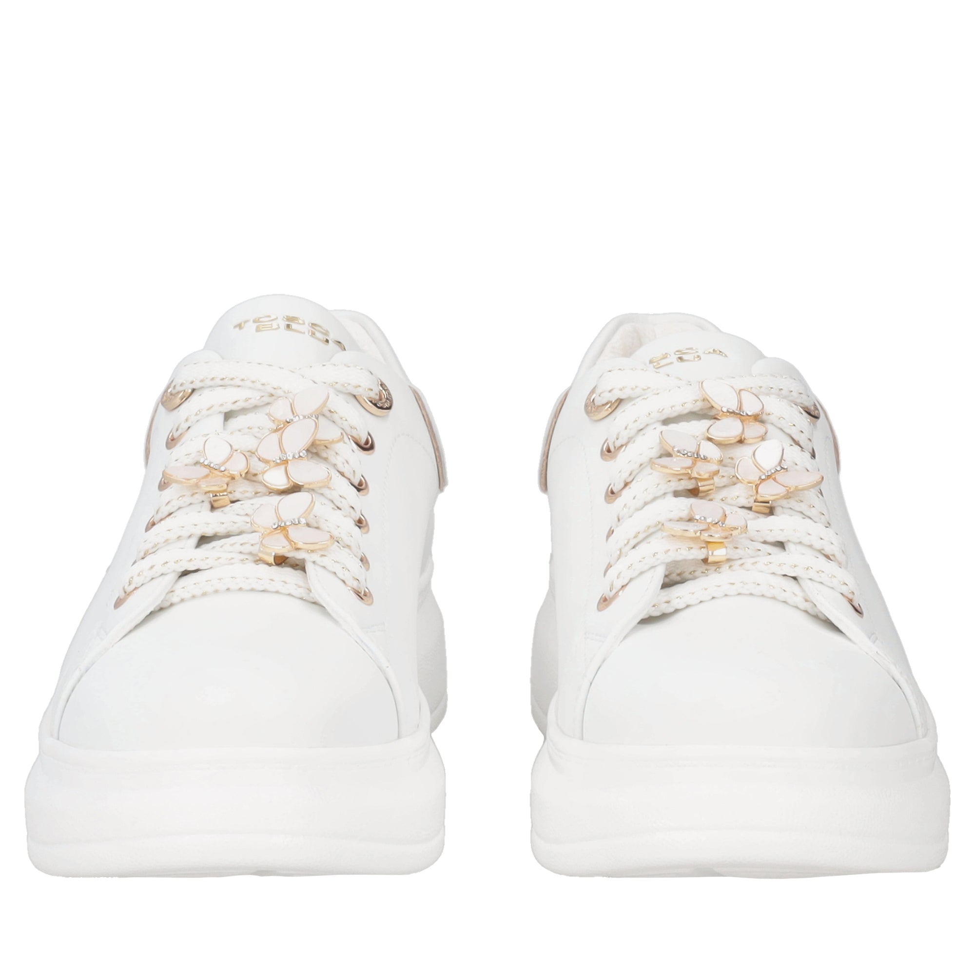 These white leather sneakers add a delicate and sophisticated touch to your everyday outfits. The thick sole ensures comfortable walking from morning to night, while the white butterflies on the laces add a playful and carefree detail. The Tosca Blu logo is featured on the tongue and in a perforated version on the side. Let yourself be won over by the practicality and refinement of these leather trainers, ideal for tackling the season in style.
