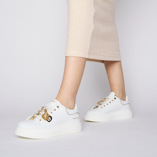 This Tosca Blu sneaker in white leather features a series of contrasting gold-tone details, such as the gleaming eyelets, charms and a heart-shaped pendant. Curated down to the smallest detail, this shoe has been completed with the perforated Tosca Blu monogram on the side and logo lettering printed on the top of the tongue. The high platform sole and soft internal padding make for both supreme comfort and practicality. This leather sneaker is the perfect way to flaunt unimpeachable style, even on the most hectic of days.