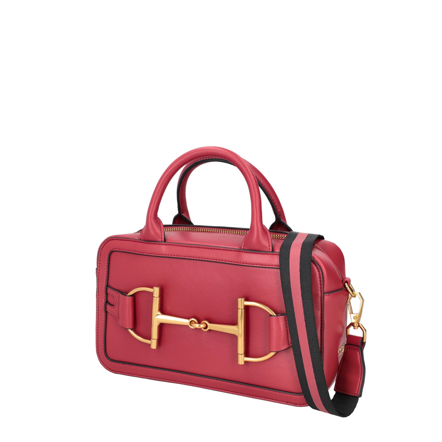 This practical chic Boston bag has been crafted with a semi-rigid frame in a dark-red palette and will instantly impress. The handy removable adjustable strap in webbing with a buckle detail will allow you to adapt it to your requirements and wear it over one shoulder or pulled across the body. The handbag interior has been completed with a single lined compartment and two storage pockets, one of which closes with a zip. This Boston bag has been stylishly completed with a refined metal horsebit in a copper-gold tone and will round off your day-to-day dressing with a chic touch.