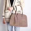 Amp up your style credentials with this shopping bag made of mud-brown suede leather. It is a versatile on-trend accessory that ensures both an elegance aesthetic and practicality. It has been equipped with a single spacious compartment, giving you enough room to stash away all your essentials. The magnetic clasp provides you with quick and easy access while the capacious structure makes it the perfect choice for any occasion, whether it be for work or running errands. This suede shopping bag is an absolute must-have for anyone seeking functionality and sophistication at the same time.