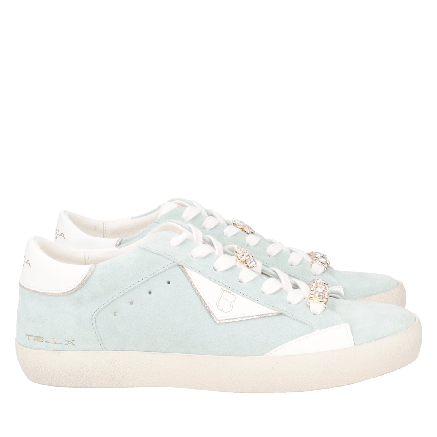 These suede sneakers in a light-green palette will bring a breath of fresh air to your spring styling. With an extremely feminine feel, these shoes feature gleaming charms on the laces that are bound to impress. The suede sneakers have the designer initials on the tongue and heel while the iconic Tosca Blu monogram features on the side.
