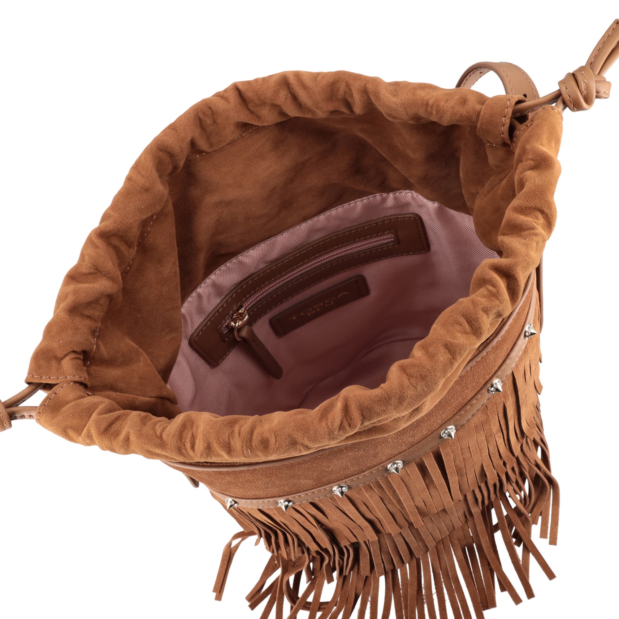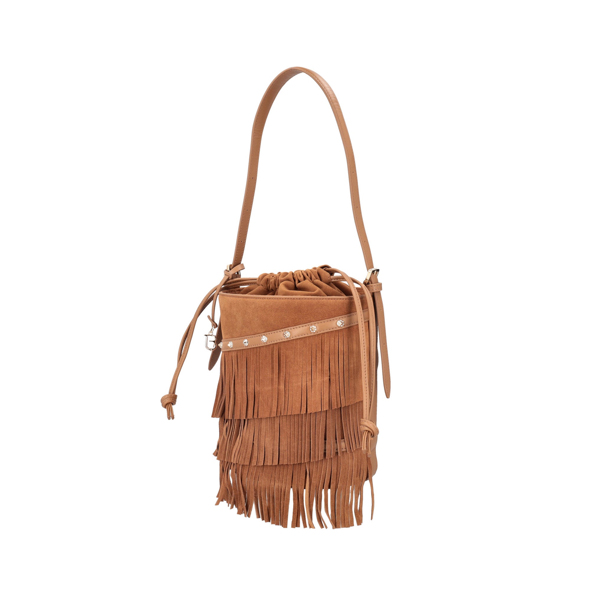 Wild Glam bucket bag with leather-colored suede fringes