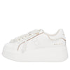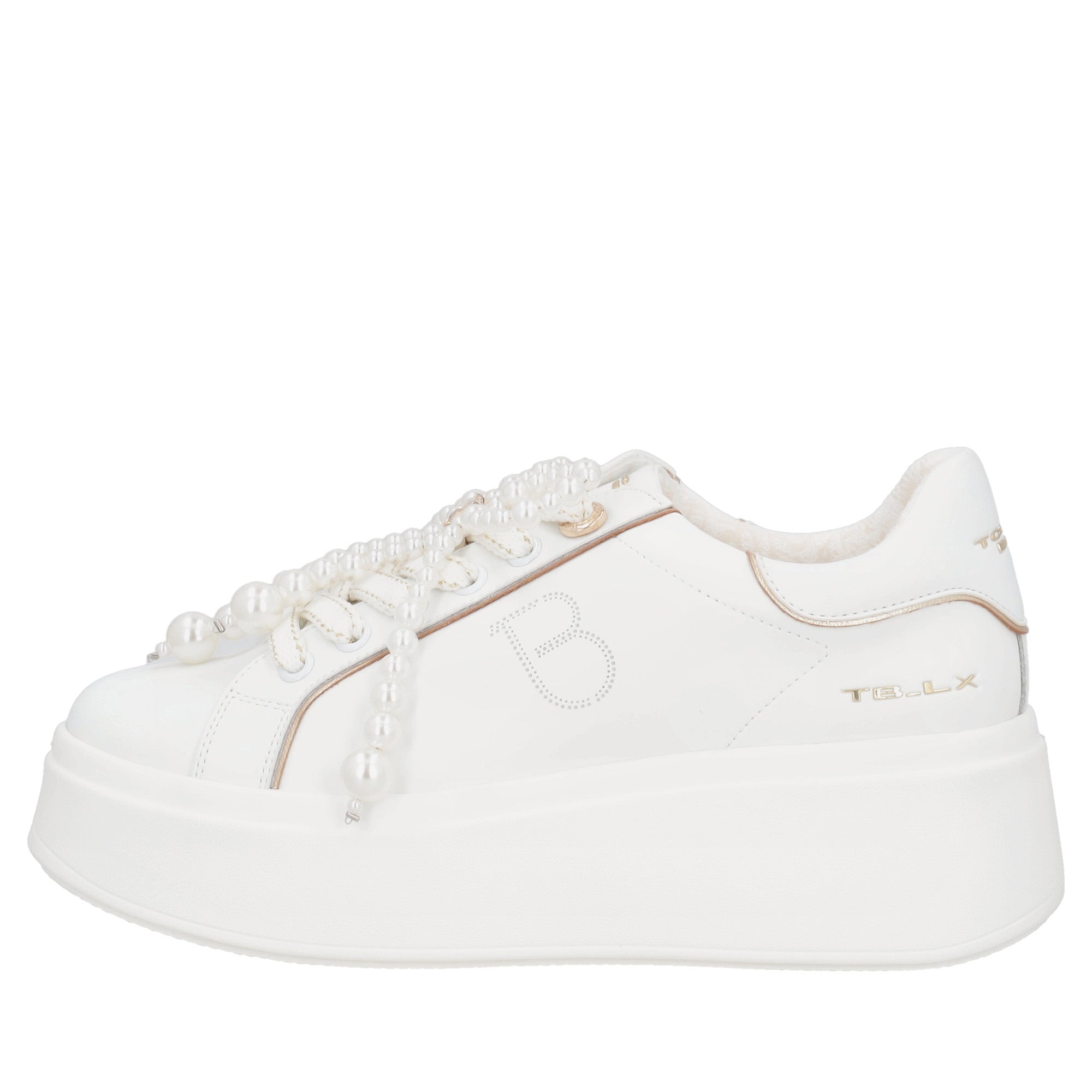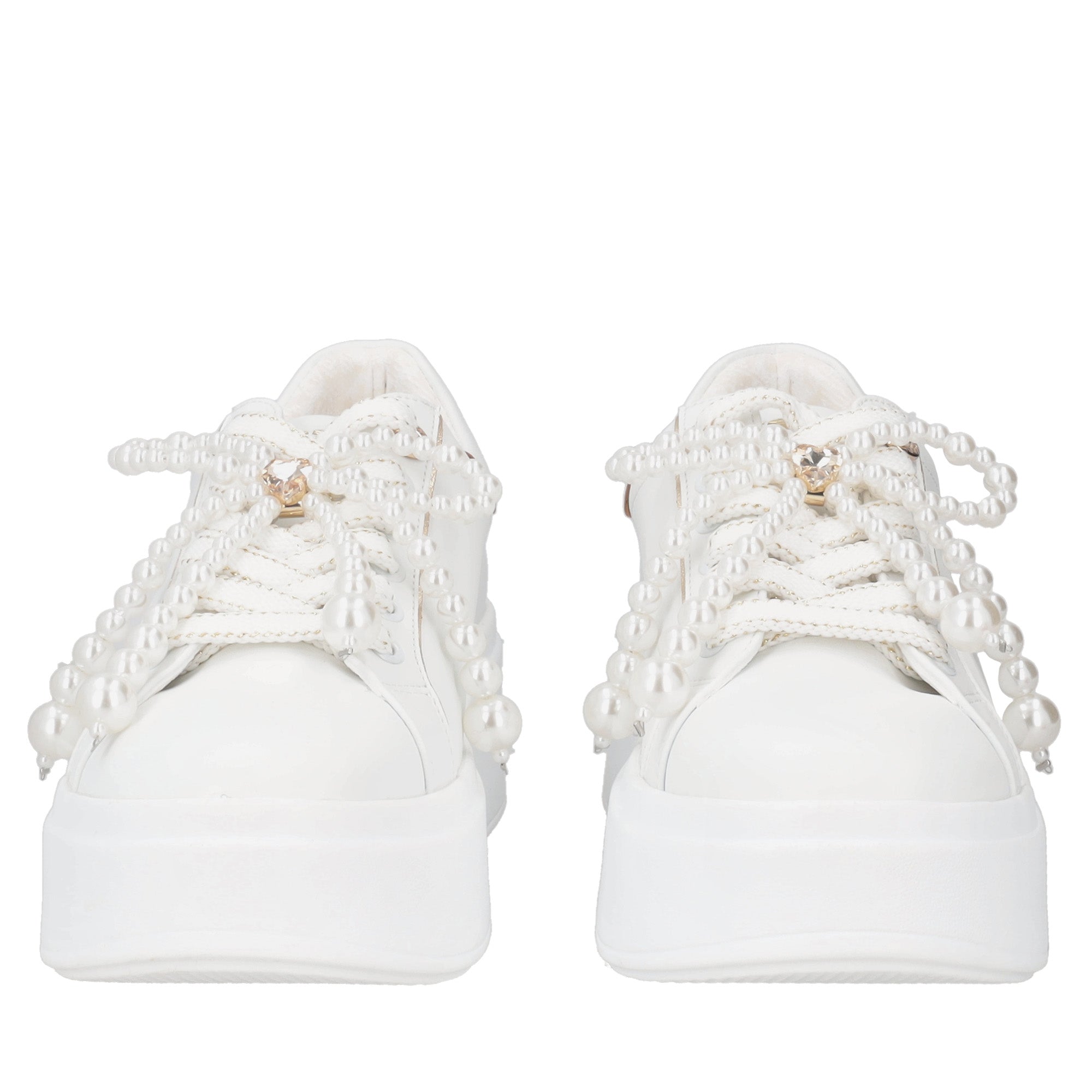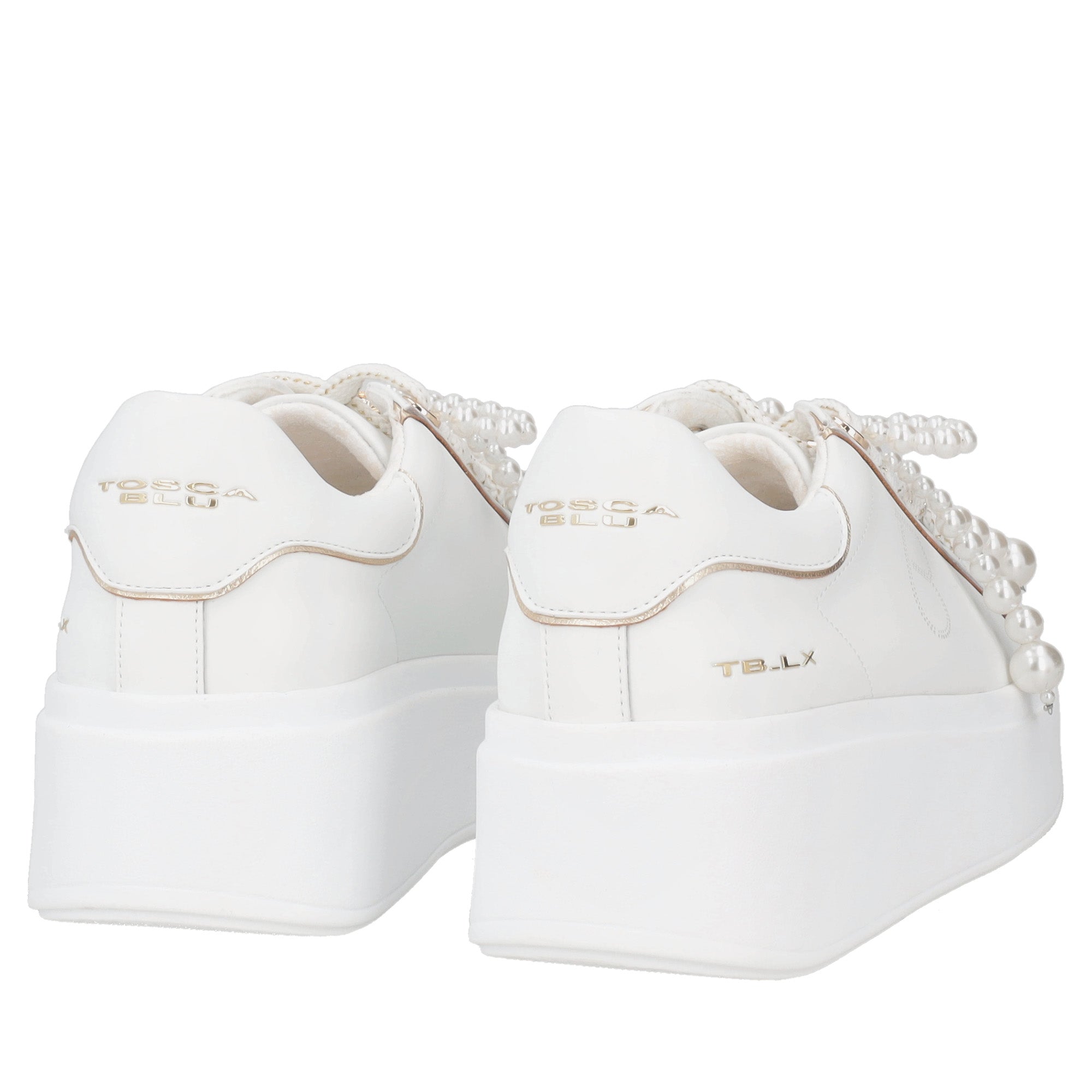 Embrace the perfect union of comfort and fashion with these leather sneakers by Tosca Blu. Designed for women who want to stand out, this model is made of white leather. These are not just shoes, they are a jewel: the decorative bow, composed of a sparkling cascade of pearls, transforms your leather sneakers into a glamorous accessory. The bold and comfortable platform sole slims the figure, while the gold details along the edges add a touch of discreet luxury.