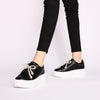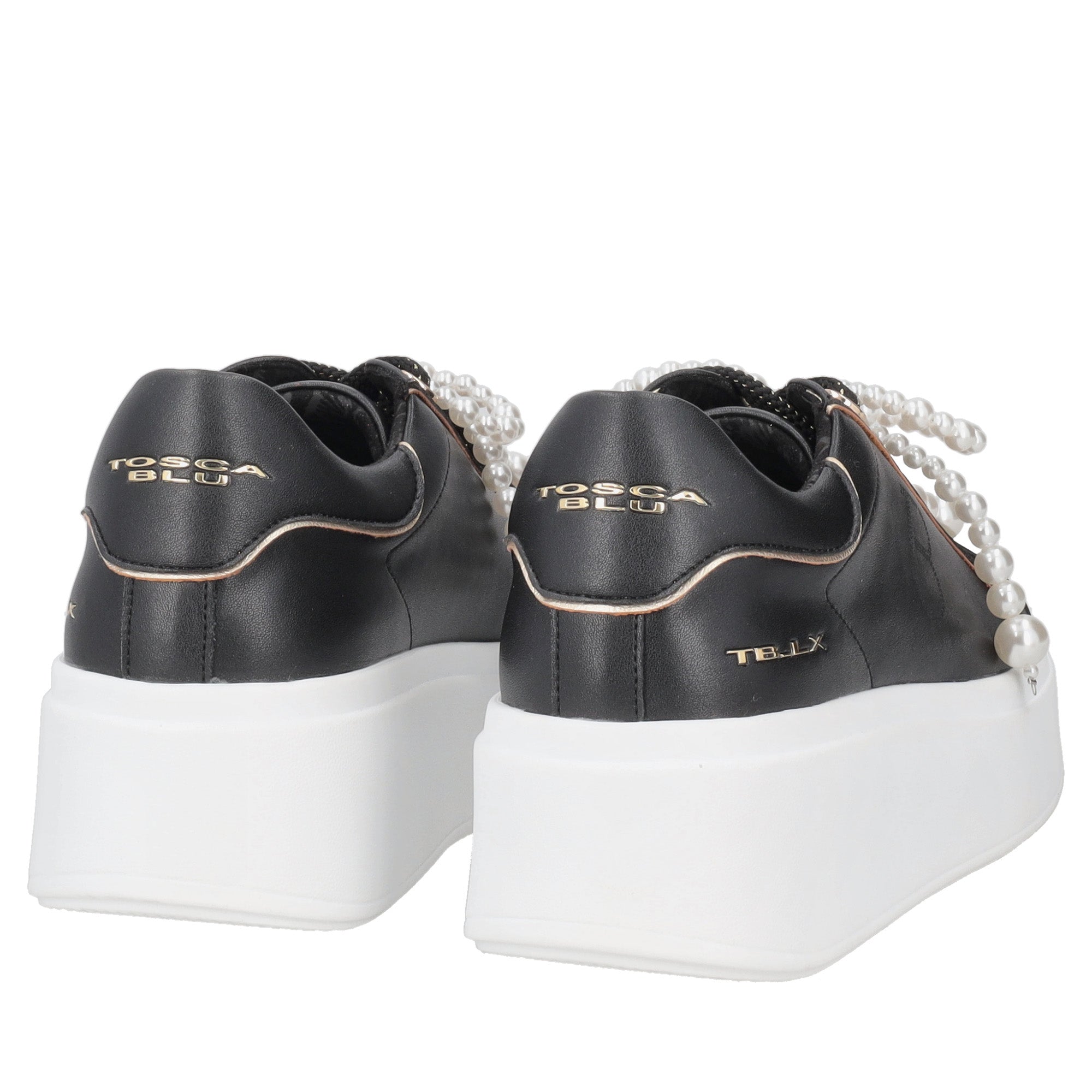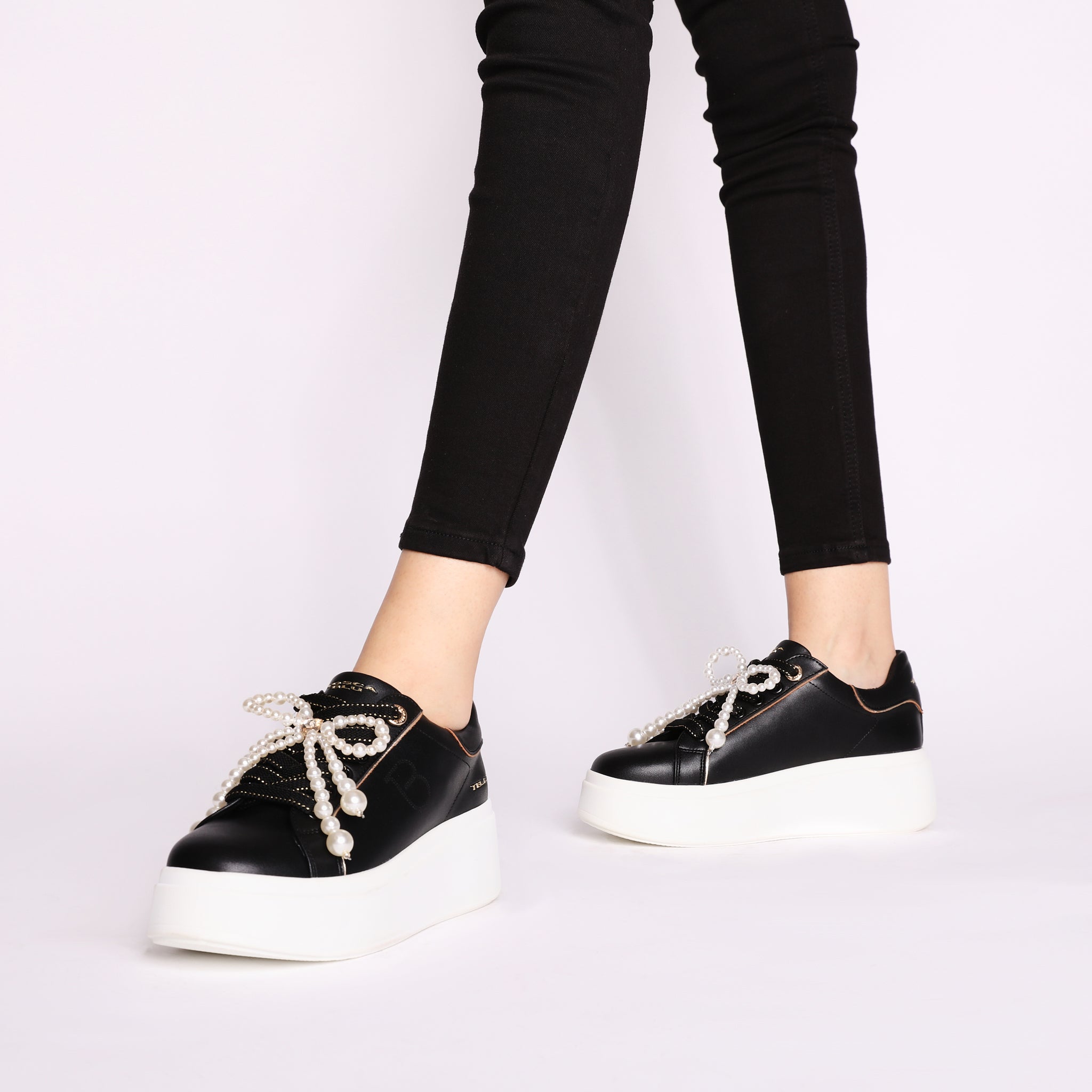 Embrace the perfect union of comfort and fashion with these leather sneakers by Tosca Blu. Designed for women who want to stand out, this model is made of black leather. These are not just shoes, they are a jewel: the decorative bow, composed of a sparkling cascade of pearls, transforms your leather sneakers into a glamorous accessory. The bold and comfortable white platform sole slims the figure, while the gold details along the edges add a touch of discreet luxury.