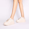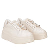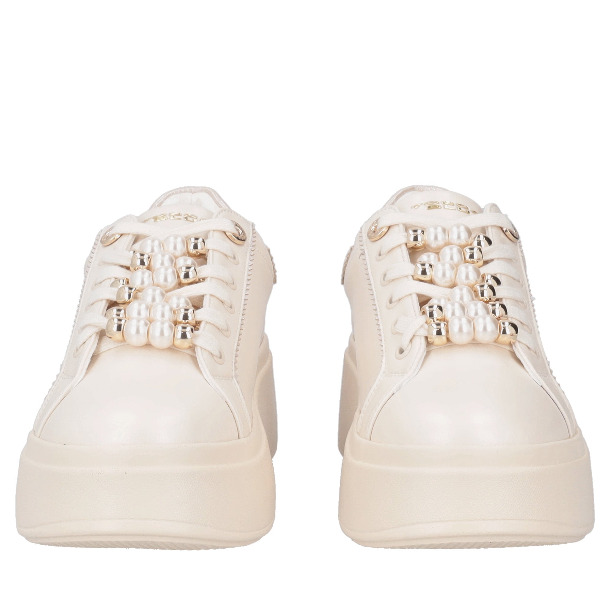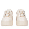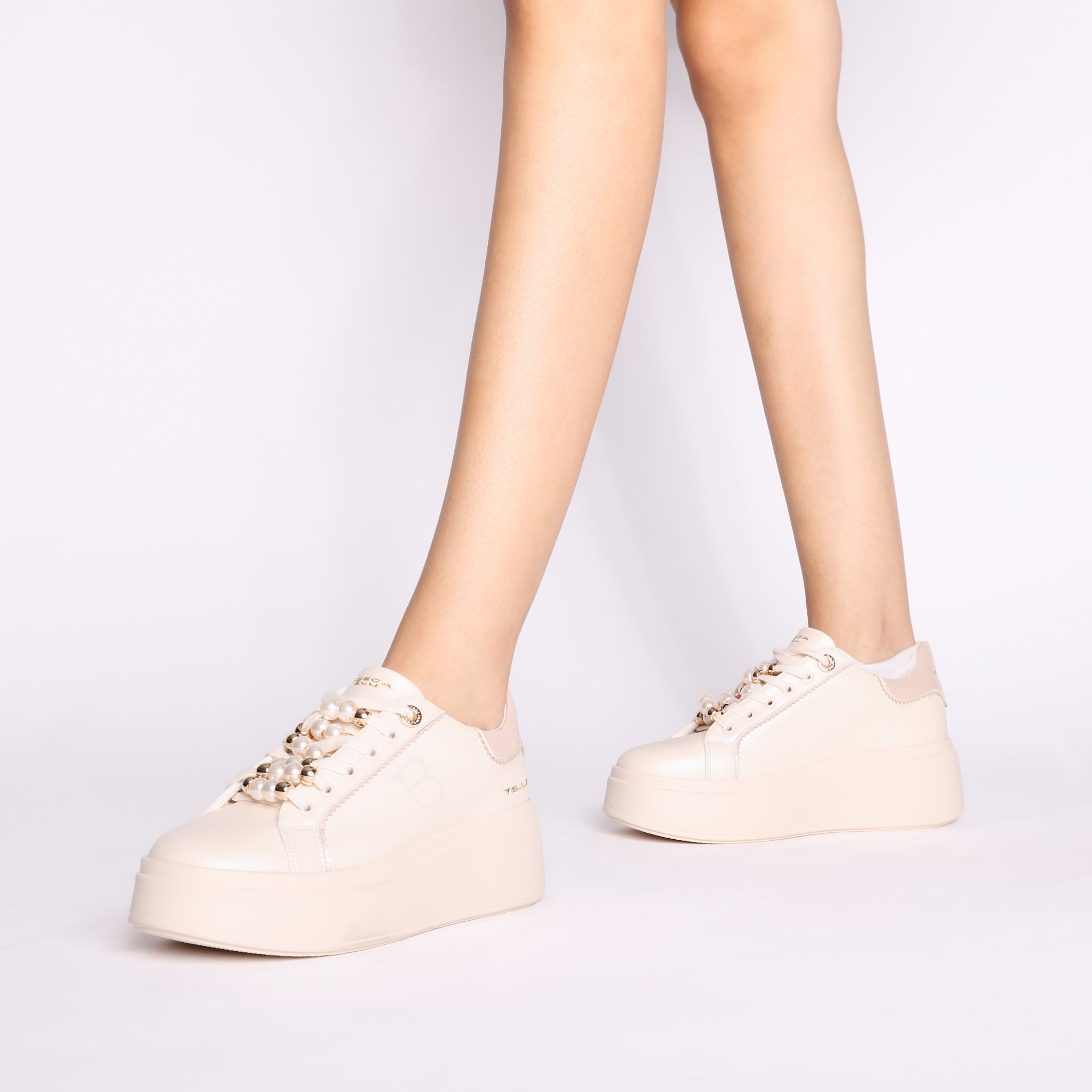Elevate your everyday style with the new beige leather sneakers by Tosca Blu. Easy to slip on and soft to wear, these high-soled shoes are embellished with eye-catching sparkling pearls on the laces, adding a touch of glamour to your style. These leather sneakers will accompany you with comfort and elegance on any occasion.