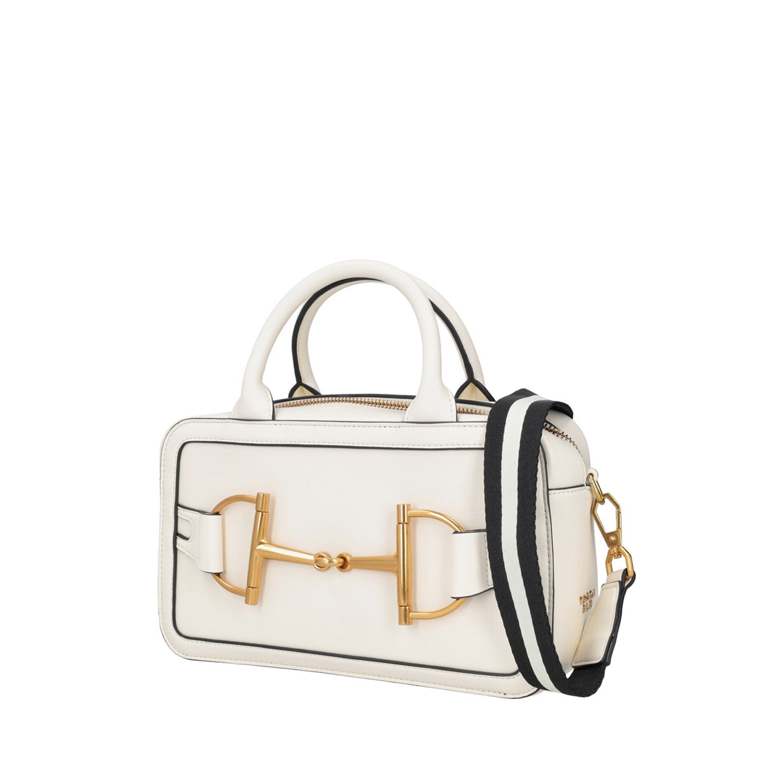 Ti conquisterà fin da subito questa borsa bauletto pratica ed elegante, disegnata con struttura semirigida e declinata in colore avorio. Grazie alla pratica tracolla a nastro, removibile e regolabile con fibbia, puoi scegliere se portarla a mano o indossarla crossbody. All’interno, la borsa a mano presenta un unico scomparto foderato e due tasche portaoggetti, una delle quali zippata. Completa con raffinatezza il modello l’accessorio a morsetto in metallo color oro ramato, un dettaglio raffinato che rende questa borsa bauletto perfetta per completare con stile i tuoi daily look.