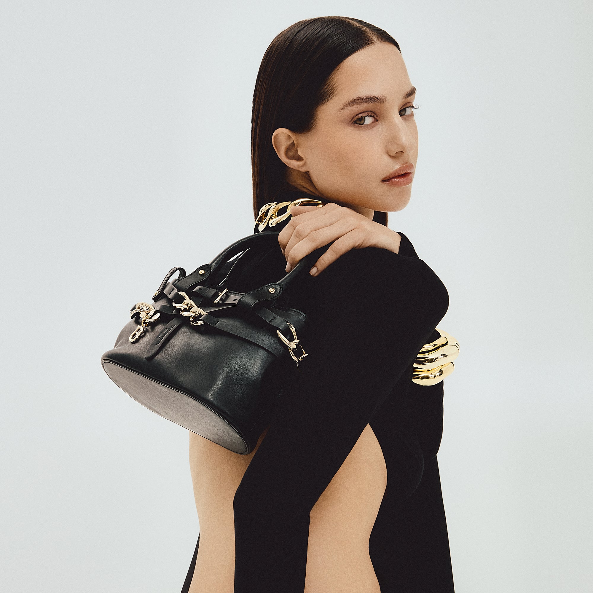 Eleganza in miniatura per la borsa mini in pelle di Tosca Blu. Proposta in pelle di colore nero, questo modello gioca con i contrasti creati dall'accostamento delle fettucce e delle catene dorate. Perfetta come borsa a mano per cerimonie o come mini bag con tracolla per i tuoi look urban, è resa unica da dettagli ricercati come il logo in metallo e il charm con monogramma. Questa borsa mini in pelle è un mix irresistibile di classe e grinta, l'accessorio da sfoggiare a più non posso.