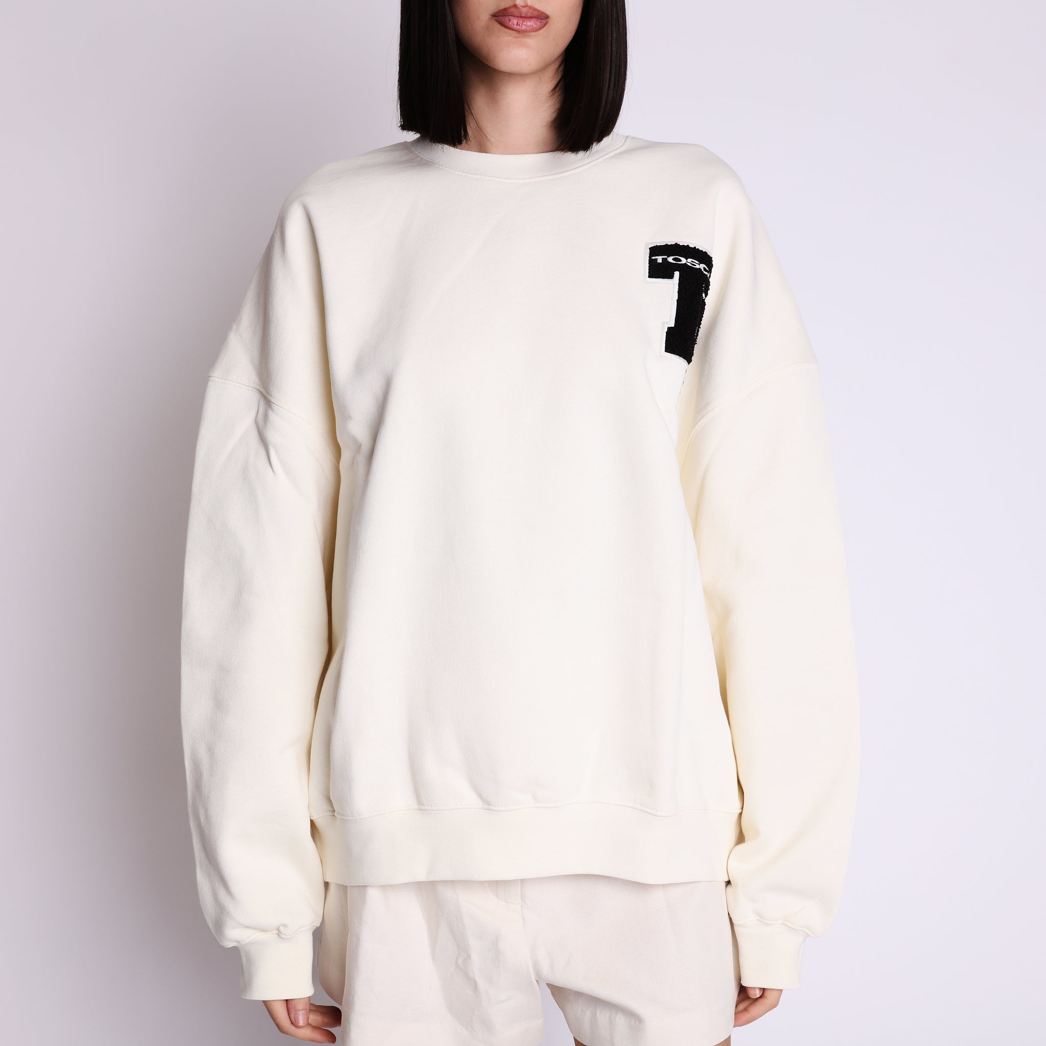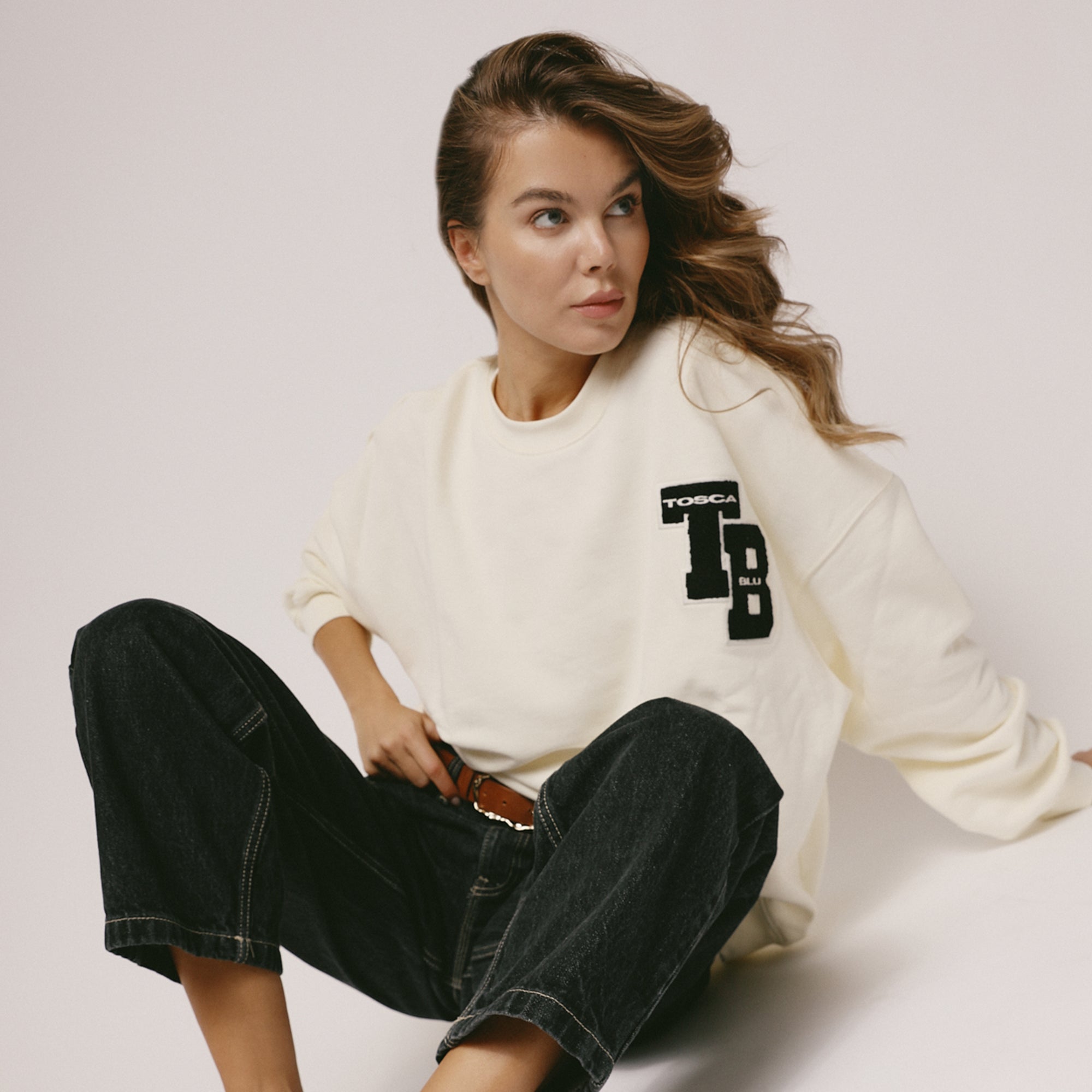 Con questa felpa college con logo, Tosca Blu reinterpreta in chiave femminile un capo iconico dal mood varsity contemporaneo. Confezionata in morbido cotone color latte e caratterizzata da spalle scese e volumi over, la felpa college avvolge la silhouette con una vestibilità rilassata e confortevole. Completano il modello il morbido girocollo, i polsini e il fondo a costine, ma il vero protagonista è il maxi logo a contrasto sul petto che aggiunge identità al capo.