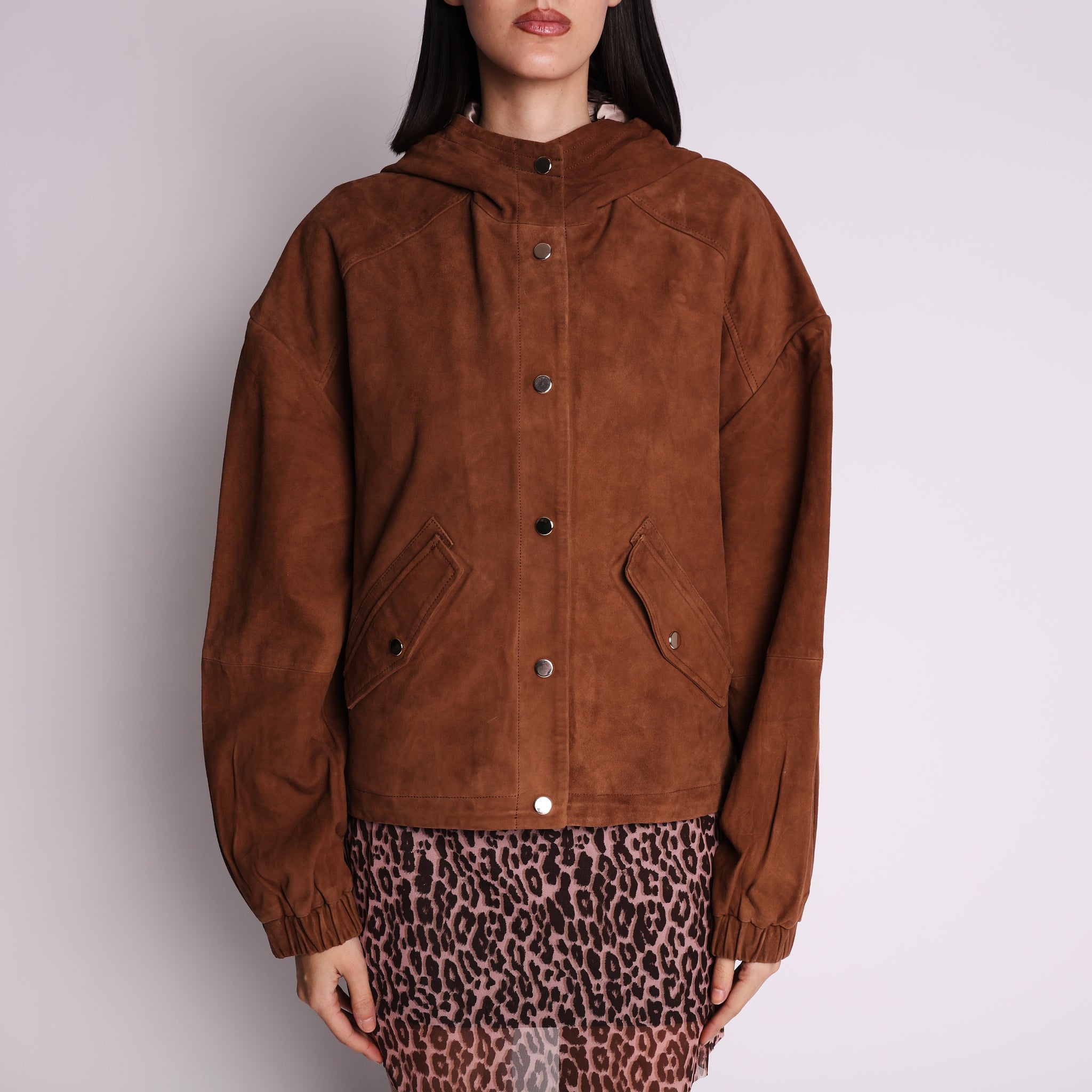 Per la nuova stagione, Tosca Blu presenta questo giubbino in suede con cappuccio color cognac, per uno stile urban dall'eleganza rilassata. Confezionato in pelle scamosciata, presenta una linea leggermente over, con spalla scesa, maniche morbide e polsini elasticizzati. Completano il capo la chiusura con bottoni a pressione e la doppia tasca con patta e bottoni. Aggiungi al tuo guardaroba questo giubbino in suede con cappuccio, confortevole e versatile.