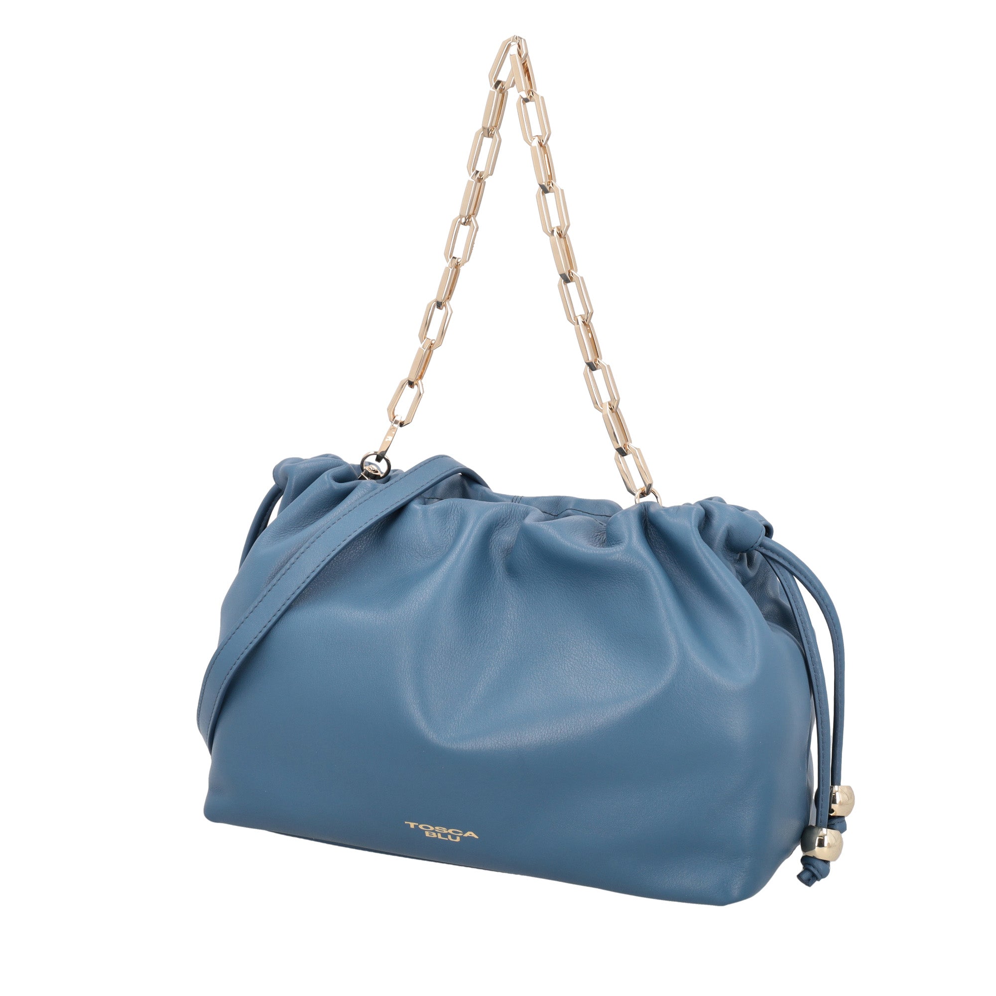 Cattura ogni sguardo con questa pochette grande in pelle firmata Tosca Blu. Declinata in colore blu, offre un design morbido e sofisticato, per elevare con grazia ogni tuo look. La chiusura con calamita, leggermente arricciata per creare dinamicità nella silhouette, custodisce i tuoi oggetti essenziali nell'ampio scomparto interno. La catena color avorio dona un tocco di luce, mentre la tracolla in pelle assicura comfort durante la giornata. Scegli la versatilità senza rinunciare al lusso con questa pochette grande in pelle firmata Tosca Blu.