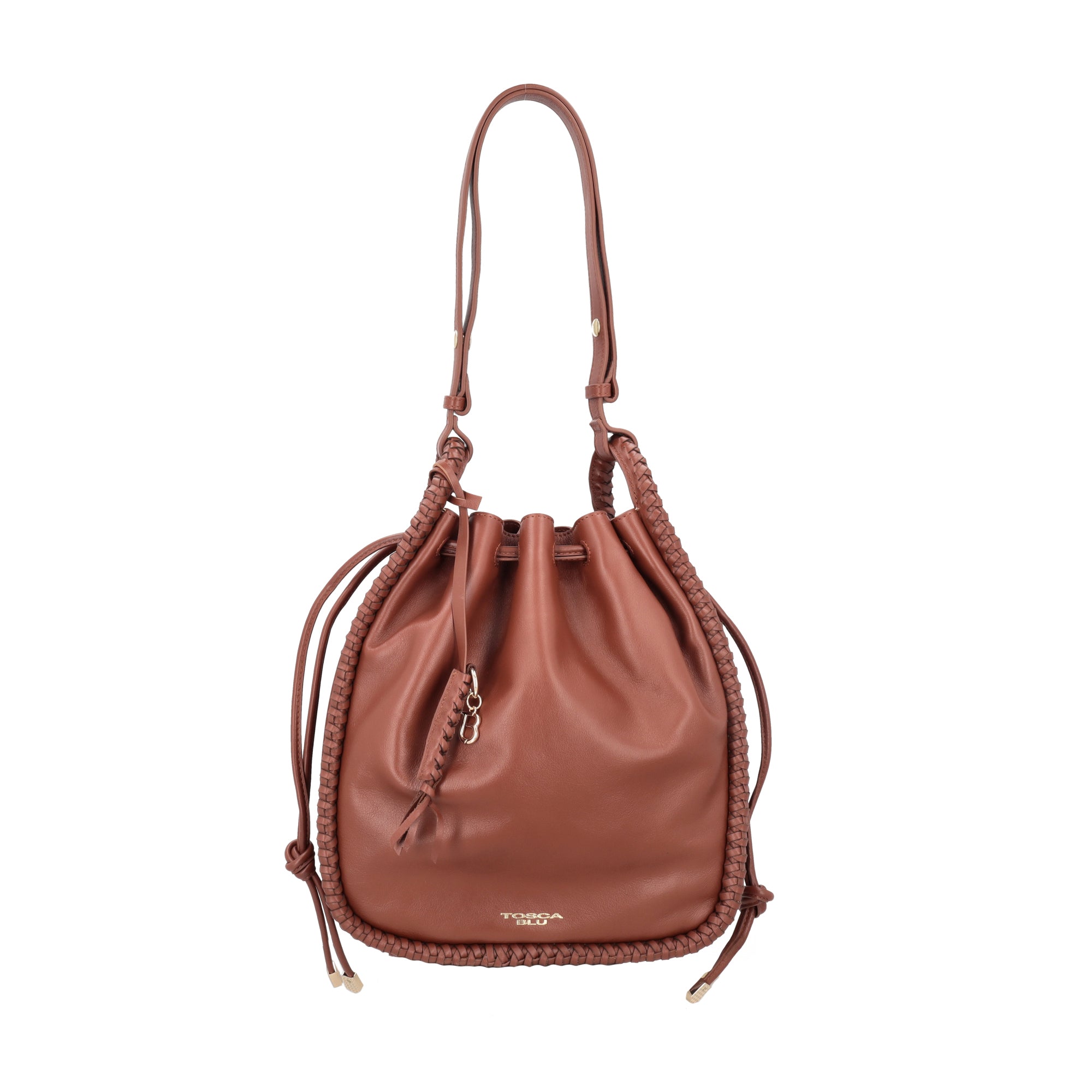 La borsa a secchiello in pelle color cuoio firmata Tosca Blu presenta un design senza tempo, perfetto per ogni occasione. Realizzata con una struttura semirigida e chiusa con coulisse, dispone di un unico grande scomparto che ti consente di tenere sempre al sicuro e a portata di mano i tuoi effetti personali. Grazie alla lunga tracolla removibile, puoi scegliere se portare la borsa a spalla o crossbody, per destreggiarti senza fatica tra i tuoi impegni quotidiani. La lavorazione intrecciata e il logo in metallo applicato sul davanti completano con raffinatezza questa borsa a secchiello, ideale per i tuoi look casual-chic, dall’ufficio al tempo libero.