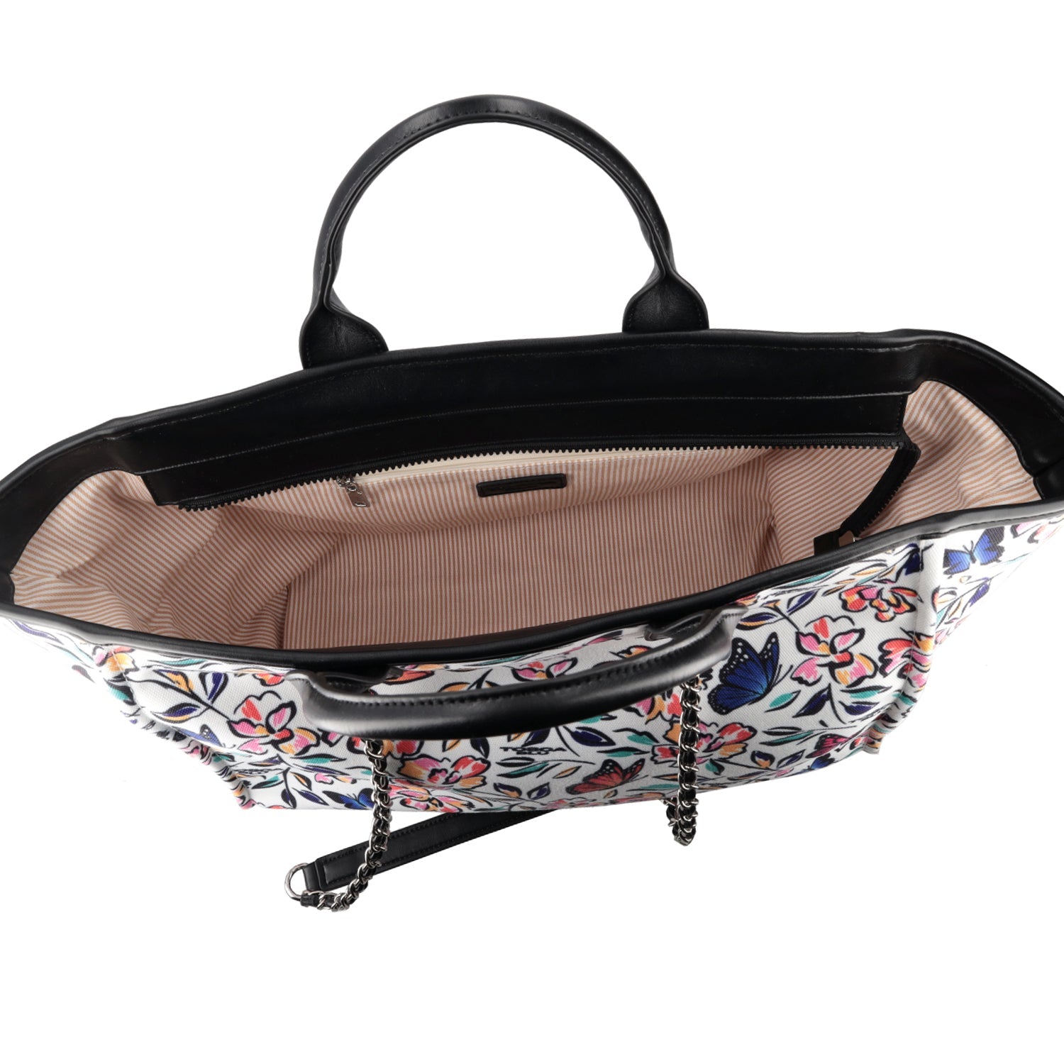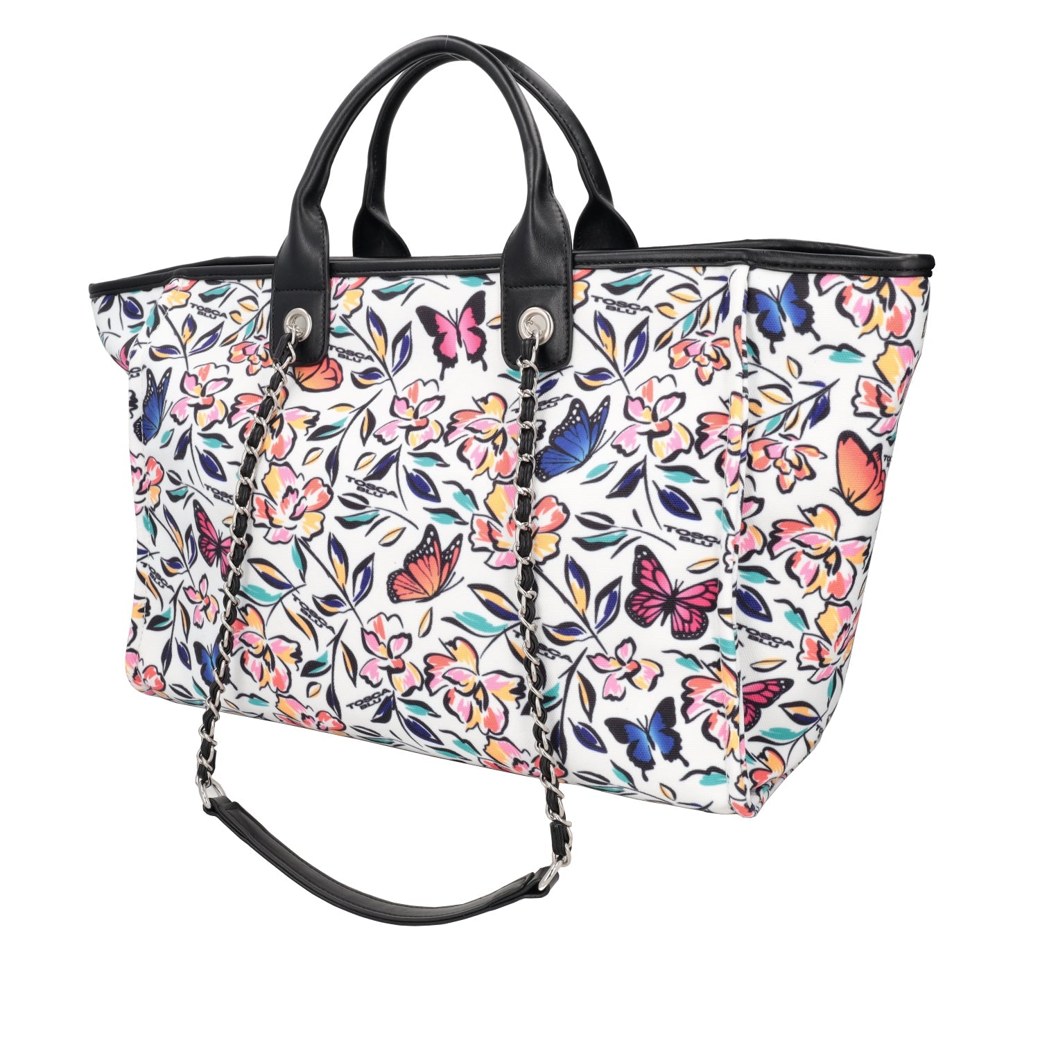Fiori e farfalle dai colori brillanti definiscono la silhouette di questa shopping bag firmata Tosca Blu. Realizzata con uno scomparto foderato, presenta al suo interno due tasche portaoggetti di cui una chiusa da zip. La scelta su come indossare questo accessorio spetta solo a te. Portala a mano oppure a spalla grazie alla tracolla con catena metallica. Con questa shopping bag potrai dare una vera a propria ventata di freschezza ai tuoi daily look.