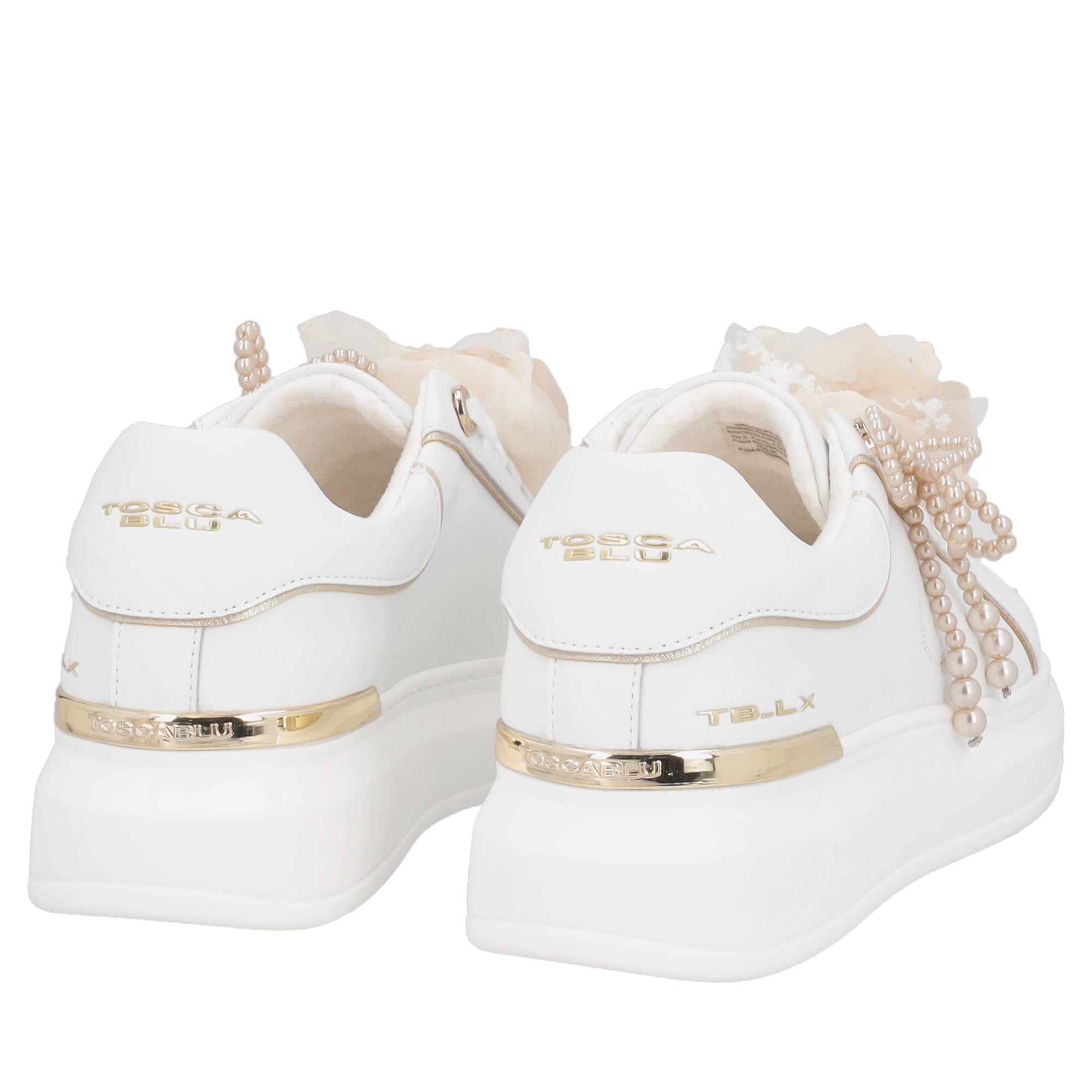 Tosca Blu presenta queste sneakers in pelle di colore bianco. Comode e versatili, sono le calzature ideali per accompagnarti nelle più svariate occasioni, casual o eleganti. La suola platform slancia ed esalta la tua silhouette e l’originale accessorio a fiore in tulle applicato sui lacci soddisfa anche i gusti più raffinati. Tosca Blu firma le sneakers in pelle sul tallone imbottito e sul lato con l’inconfondibile logo traforato.