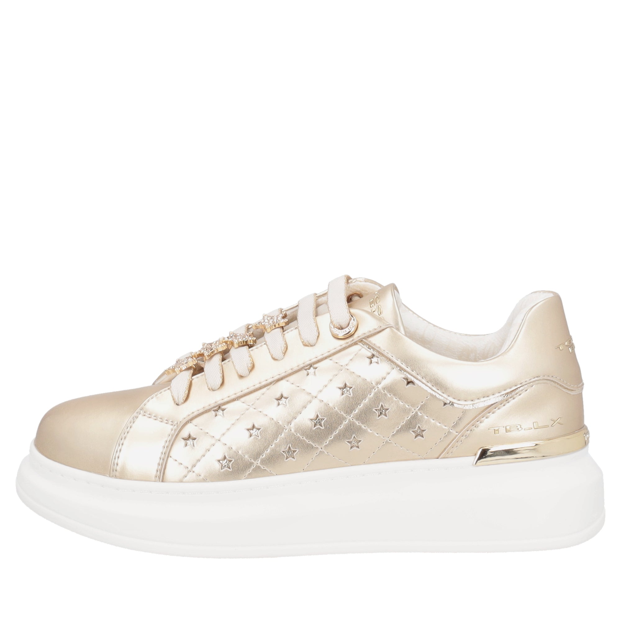 Queste sneaker in pelle color oro griffate Tosca Blu diventeranno le protagoniste dei tuoi prossimi outfit. Il design è impreziosito dalle cuciture sulla tomaia e dai dettagli traforati a forma di stella. I lacci, realizzati con bordatura dorata, presentano delle applicazioni con strass a forma di stella. Il comfort è assicurato dalla suola platform e dall’imbottitura interna. Indossa queste sneaker in pelle e preparati a vivere la tua giornata da protagonista.