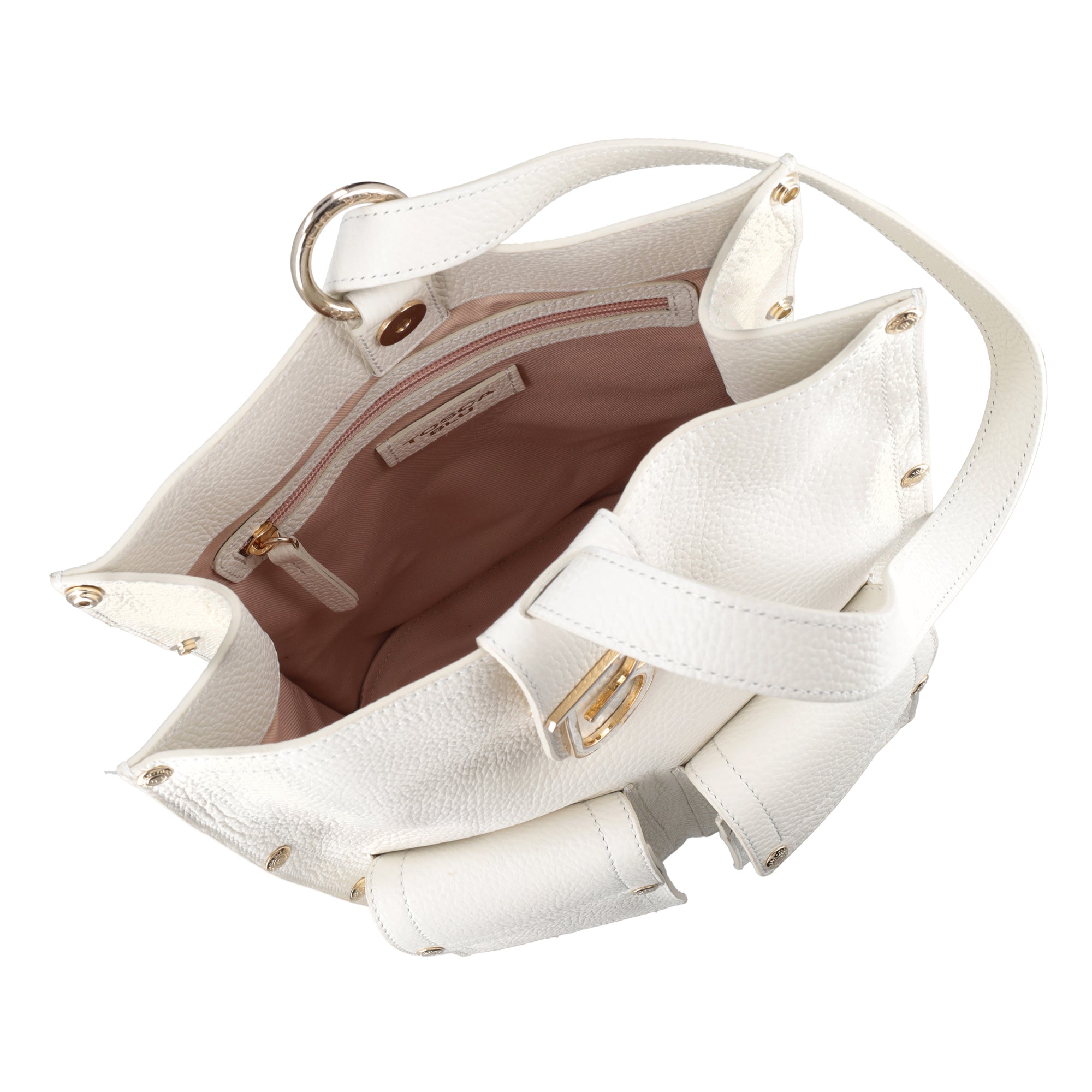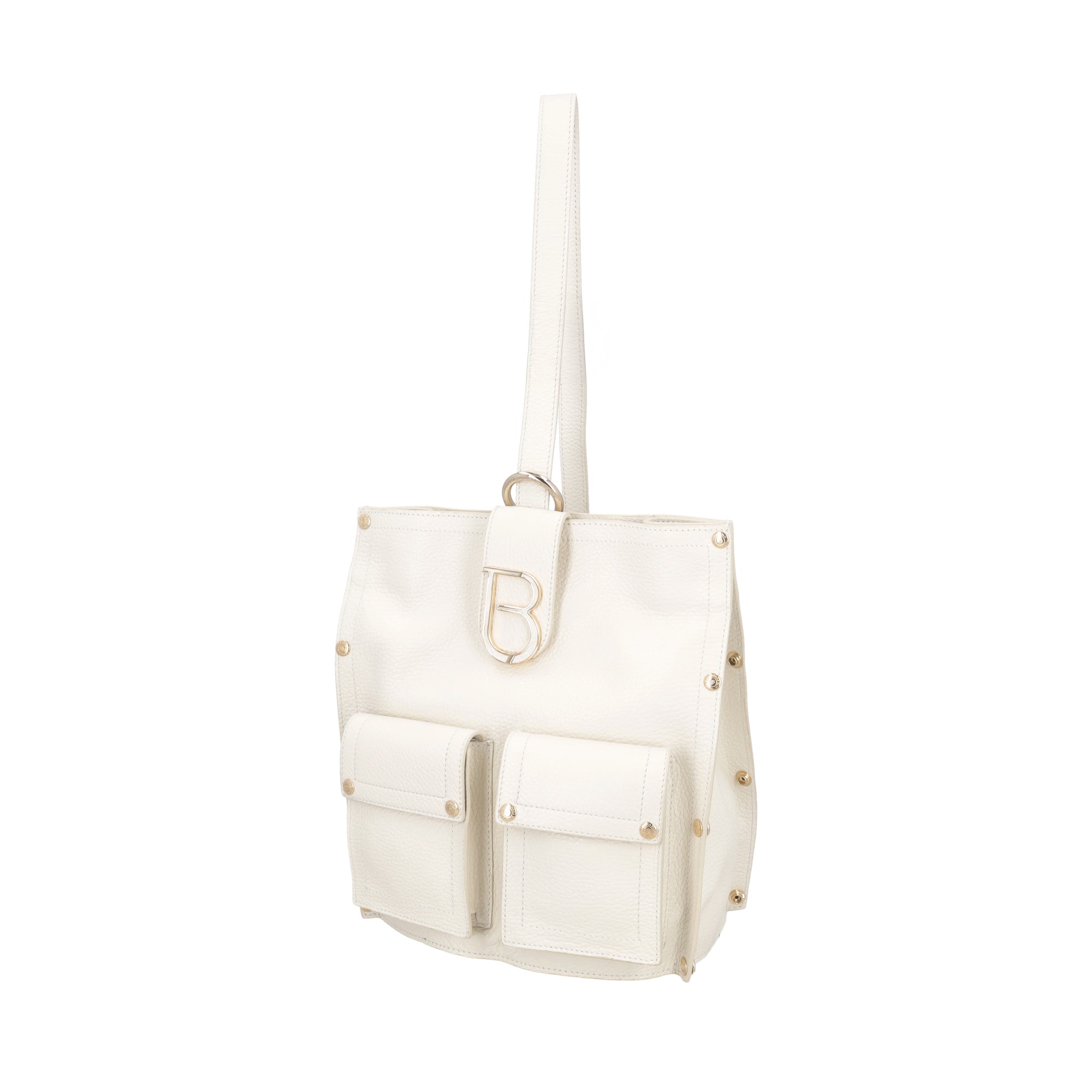 Scopri il perfetto equilibrio tra stile e funzionalità con lo zaino monospalla in morbida pelle di colore avorio firmato Tosca Blu. Impreziosito da borchie, presenta un unico scomparto principale con chiusura a bottone, due tasche frontali e monogramma applicato. Indossa questo zaino monospalla con un look total denim per un tocco urban-chic, oppure abbinalo a un abito per un'eleganza senza tempo che non rinuncia alla praticità.